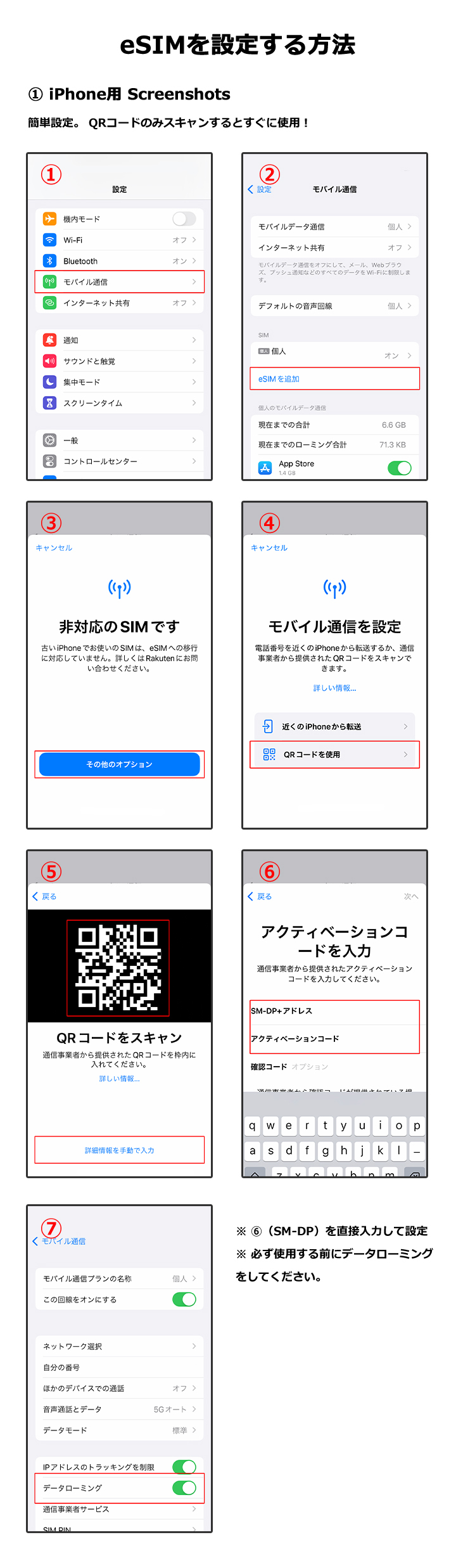 iOS : 設定 → モバイル通信 → eSIMを追加 → QRコードを使用 → QRコードをスキャン → データローミング「オン」※手動入力 : 設定 → モバイル通信 → eSIMを追加 → 詳細情報を手動で入力 → SM-DPアドレス及びアクティベーションコードを入力 → データローミング「オン」